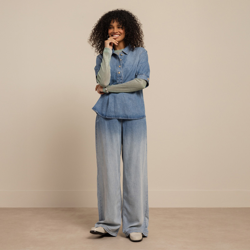 Denim ist ein robustes, gewebtes Baumwollmaterial in Köperbindung (Twill), erkennbar an den schrägen Linien. Neben klassischem Indigo gibt es viele Farb-, Stoff- und Waschvarianten. Je dunkler der Denim, desto stärker verblasst er mit der Zeit. Für mehr Komfort wird oft Stretch beigemischt – wie bei unseren Denim-Artikeln.