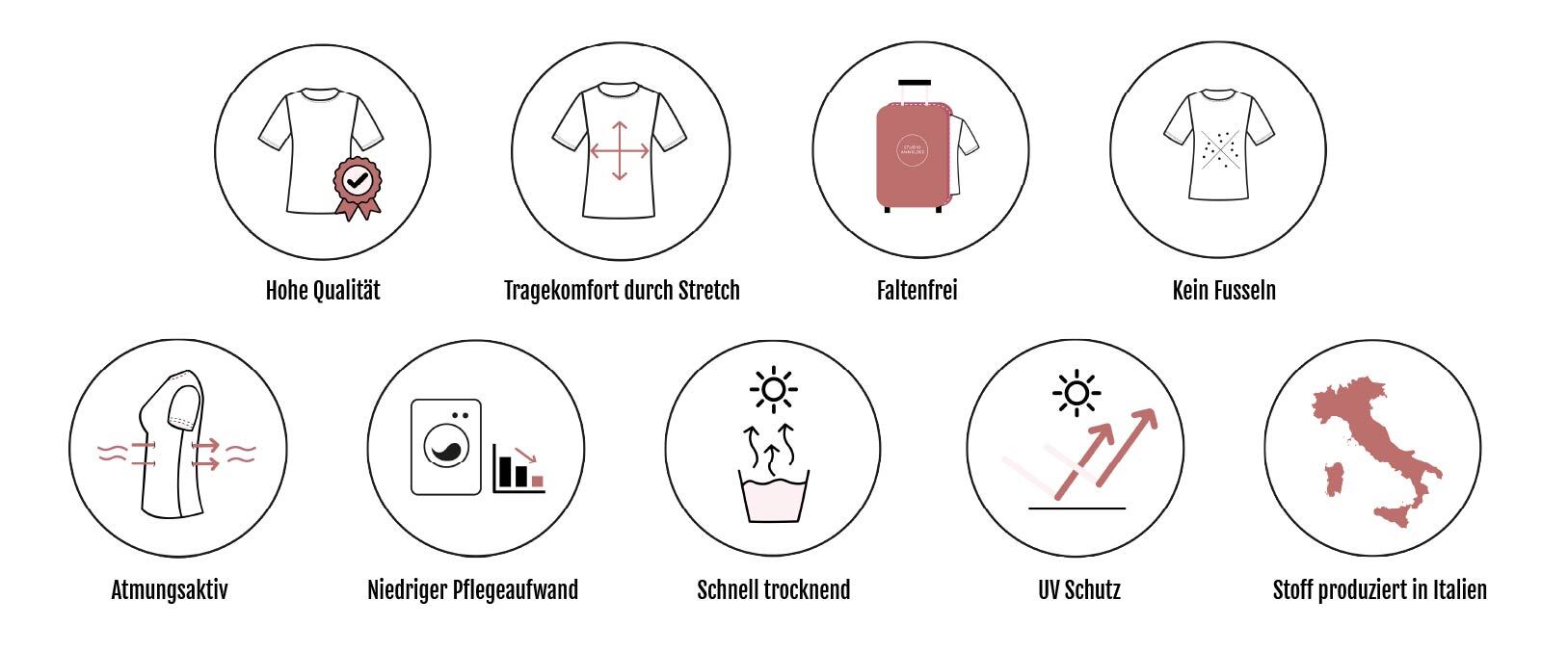 Im Pflegeetikett von Travelstoff-Artikeln ist beim Bügelsymbol ein Punkt angegeben. Das bedeutet, dass Bügeln erlaubt ist. Bügle jedoch maximal bei 110 °C und lege immer ein Tuch zwischen Bügeleisen und Stoff, um Beschädigungen am Kleidungsstück zu vermeiden.